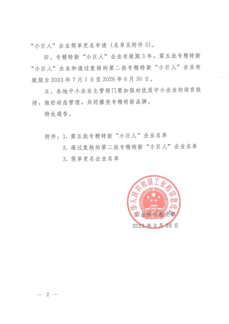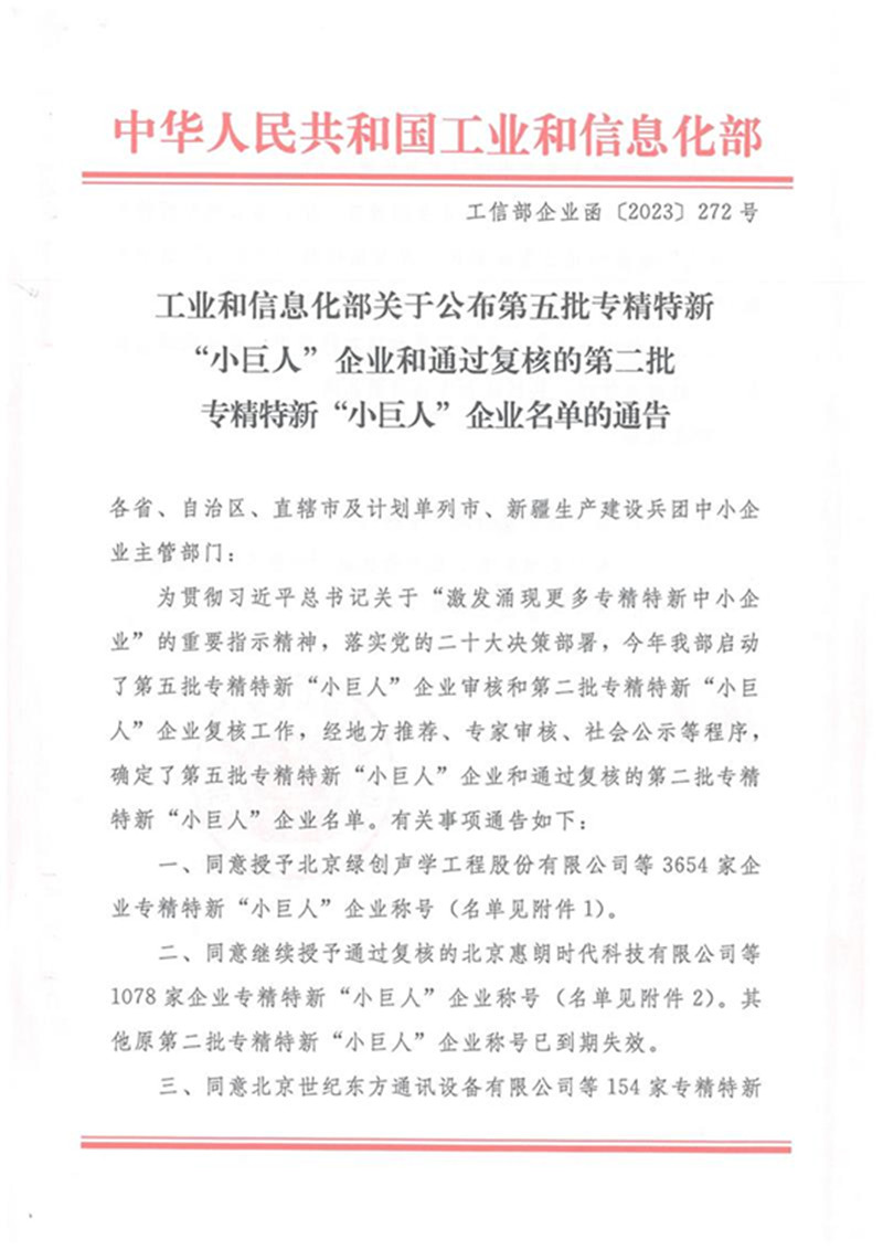 In order to implement the important directive spirit of the General Secretary Mr Xi Jinping on "inspiring the emergence of more specialized and new small and medium-sized enterprises" and the Party's the 20th National Congress decisions and deployment, the Ministry of Industry and Information Technology launched the fifth batch of specialized and new "little giant" enterprise audit work, and our company is awarded as the fifth batch of specialized, refined, and innovative "little Giant" enterprise.
