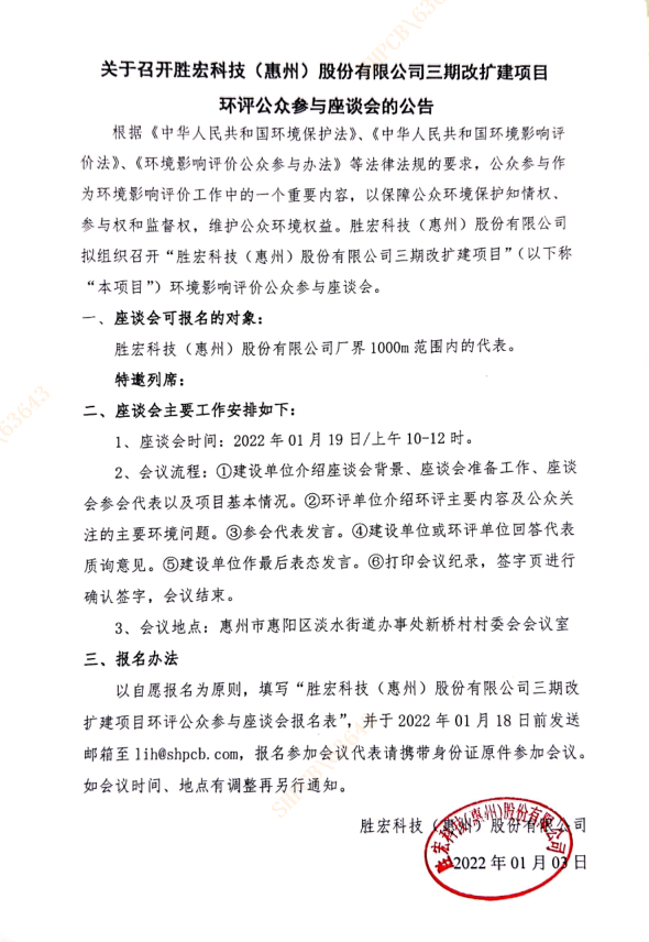 關于召開勝宏科技(惠州)股份有限公司三期改擴建項目環評公眾參與座談會的公告